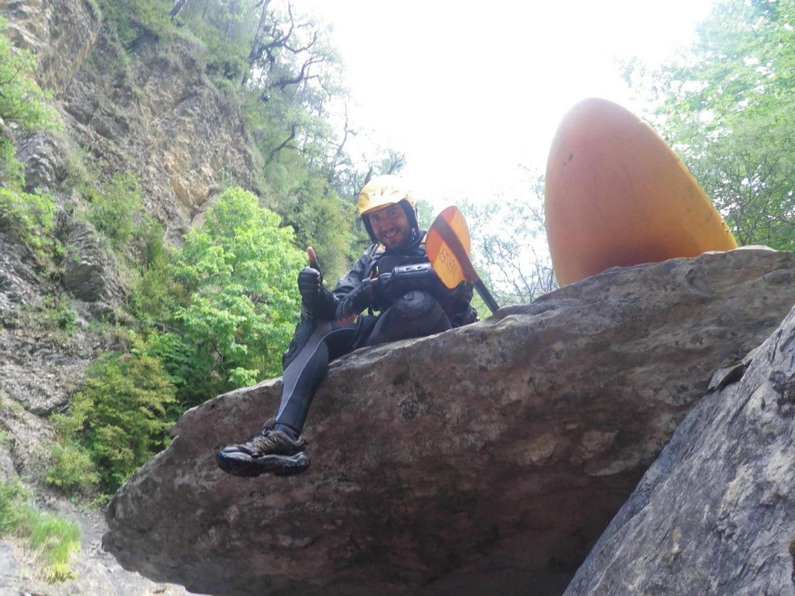 Y el domingo después de estar toda la noche lloviendo y cogiendo el río Ara un caudal potente de 2'30, Pedro, Patricio, Soriano, Agustin, Jose y yo decidimos bajar de Broto a Fiscal ya que de Torla a Broto estaba el asunto chungo si nadabas y después del día anterior que tuve pues como que no, por lo que nos alegramos ya que nuestras caras rebosaban alegría durante todo el descenso.